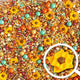 Transition from summer to fall with this warm-toned sprinkle mix featuring burgundy, golden yellow, orange, and a bright pop of mint. This mix gets its namesake from its hand-piped royal icing sunflower sprinkles.