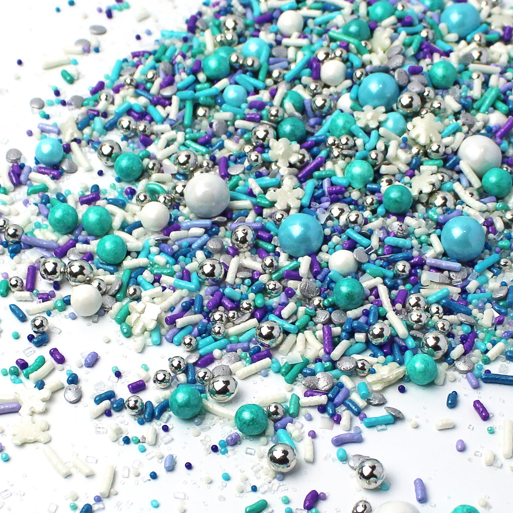 Ice Queen sprinkle mix is sure to thaw any frozen heart. You'll love our cool toned sprinkle mix featuring aqua, lavender and shimmering white snowflakes. We finished this mix off with metallic silver dragees.
